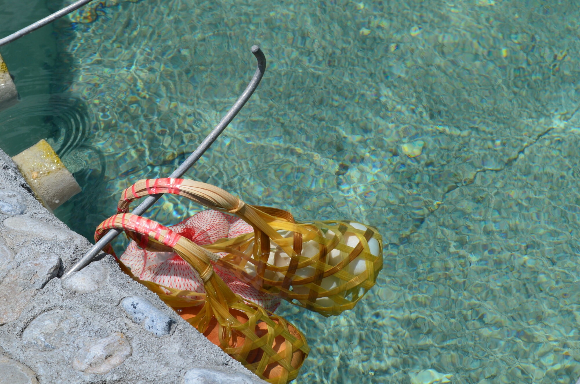 Eggs in net being boiled in the hot spring. Different area than where you dip your feet in, if you are wondering that.